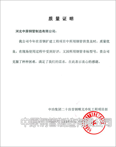 中冶集團(tuán)二十冶首鋼順義冷軋工程項(xiàng)目部業(yè)績證明